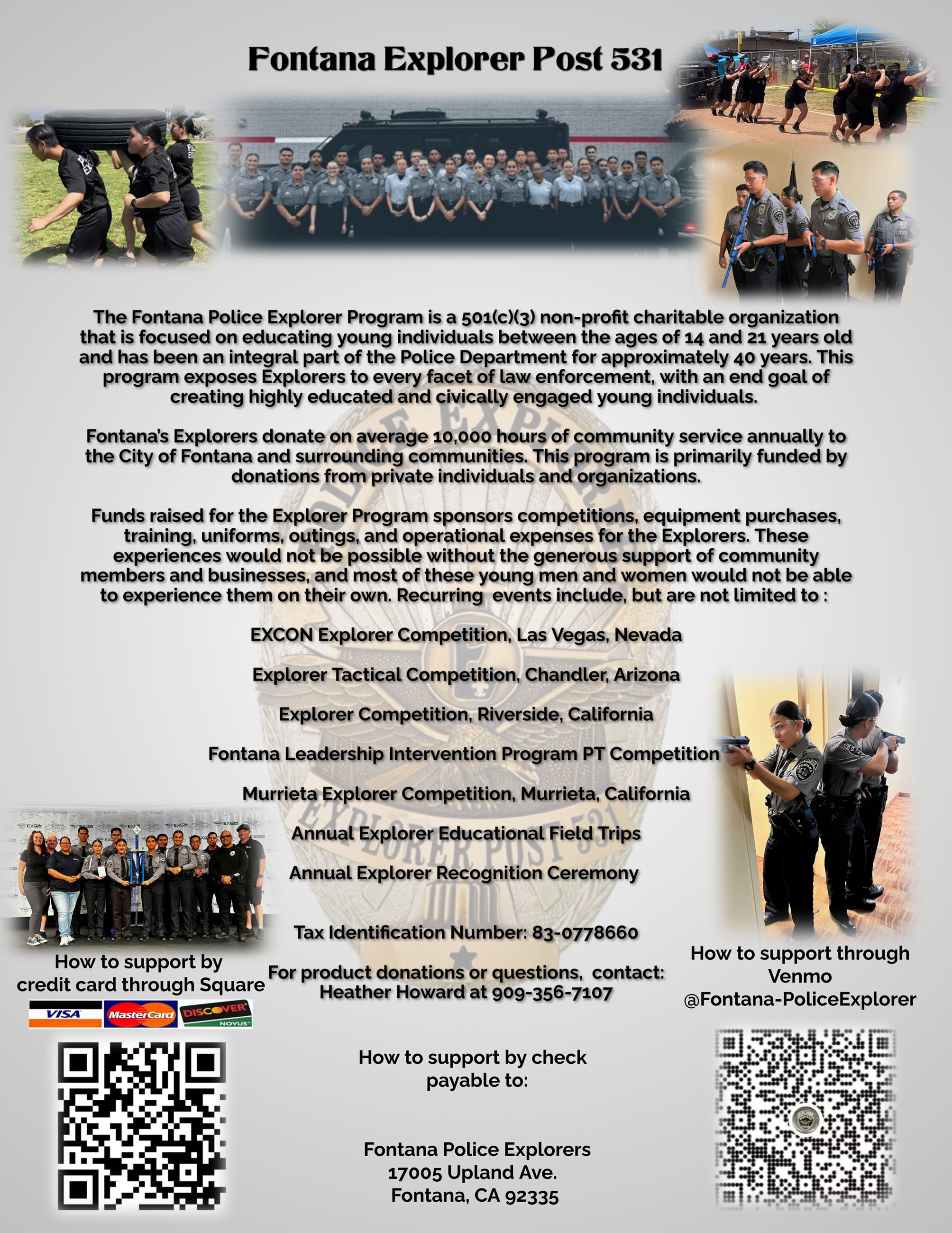 A Police Explorer is a young adult who has a desire to learn about law enforcement as a career through firsthand experience. An Explorer has the opportunity to learn all aspects and functions of the Police Department. This program offers experience in the records unit, front desk, detective unit, traffic enforcement, and a patrol officer's function through the ride-along program.